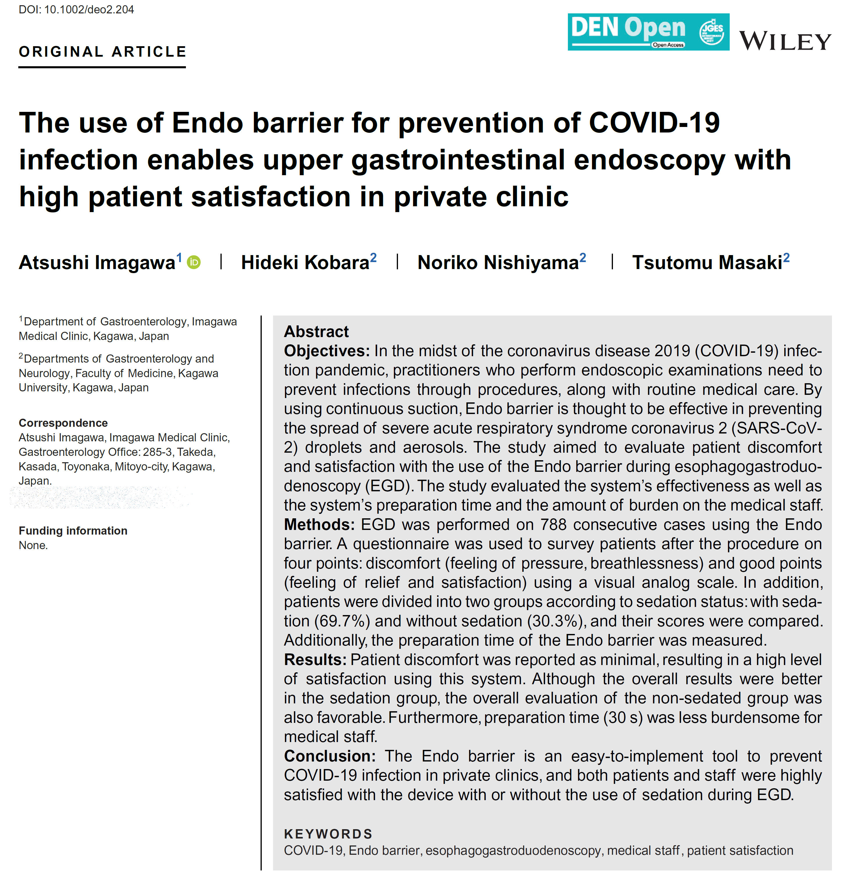 10.上部消化管内視鏡検査(胃カメラ検査)においてCOVID-19予防のためのエンドバリア(予防器具)の患者さんの満足度の検討 Atsushi Imagawa, Hideki Kobara, Noriko Nishiyama, Tsutomu Masaki. The use of Endo barrier for prevention of COVID-19 infection enables upper gastrointestinal endoscopy with high patient satisfaction in private clinic. DEN-Open. 2023:3(1):e204